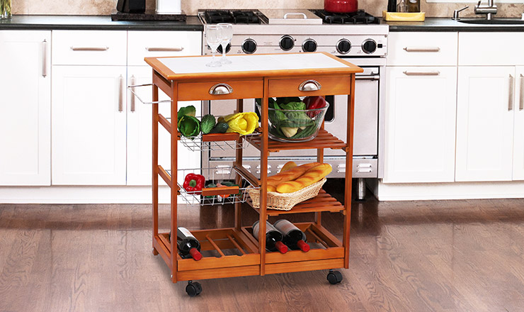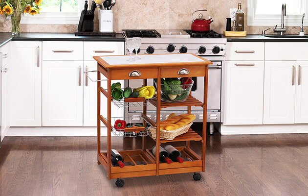 Facile da montare e pulire, è dotato di 2 cassetti, cestini estraibili e porta bottiglie. Le ruote sono dotate di sistema di blocco, così puoi spostare il carrello e tenerlo in posizione in modo sicuro.