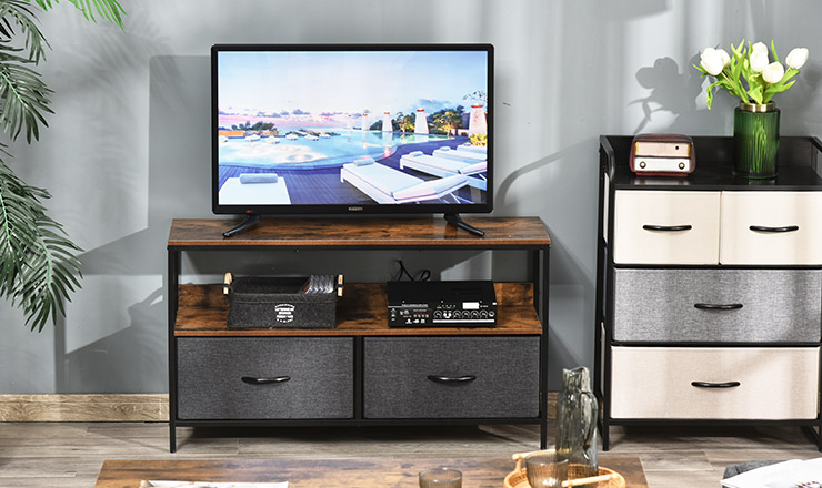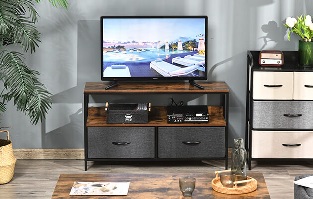 L'ampio piano d'appoggio e la mensola ti offrono tanto spazio su cui posizionare non solo la televisione ma anche riviste, console di gioco e tanto altro. I 2 cassetti in tessuto traspirante possono essere piegati facilmente e riposti in poco spazio quando non ti servono. La struttura in metallo stile industriale è dotata di pratici piedini regolabili, per mantenere la stabilità.