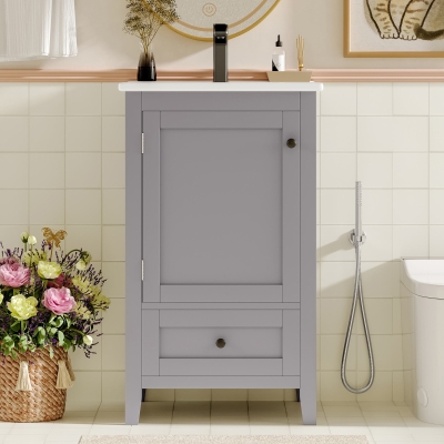 Armadio da bagno autoportante con lavabo in ceramica integrato, ripiani regolabili, 51x34x83 cm, Grigio