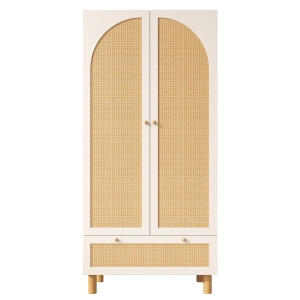Armadio portaoggetti a 2 ante con frontale in rattan, ampio cassetto, ripiani regolabili e barra appendiabiti, 85.5x52x180.5 cm, Bianco(m-11)