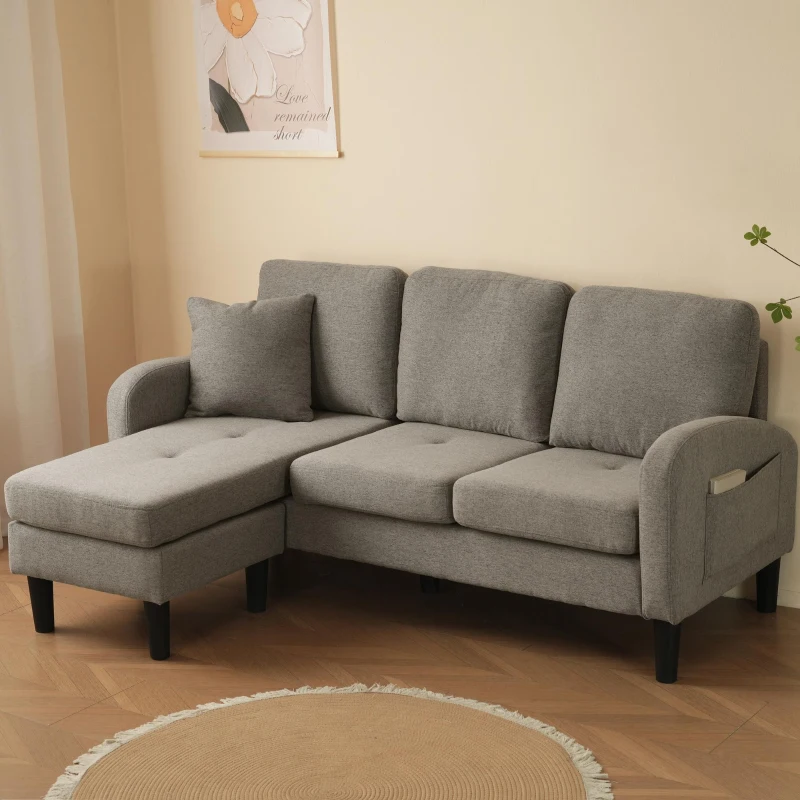Divano angolare a forma di L con chaise longue, rivestimento in cotone-lino, cuscini inclusi, 166x118x77 cm, Grigio scuro