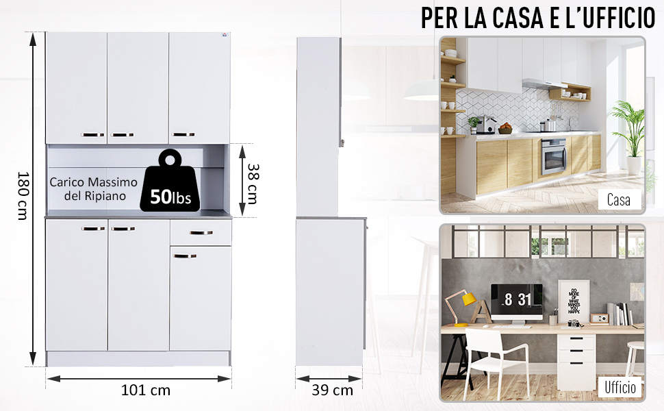 HOMCOM Credenza Cucina Moderna con Cassetto e Armadietti, in Legno, 101x39x180 cm, Bianco e Grigio