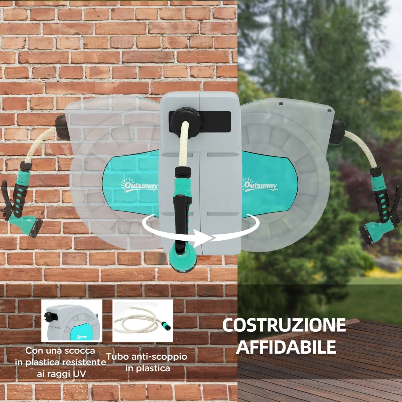 Outsunny Avvolgitubo Automatico a Parete e Portatile Lunghezza 25+2 m, Sistema di Blocco e 7 Getti, Grigio
