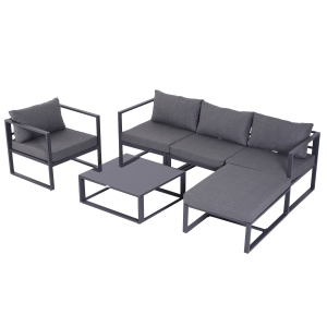 • Set da esterno pratico: Trasforma il tuo patio in una lounge all'aperto con questo elegante set grigio. Il set di sei pezzi comprende un divano ad angolo, quattro poltrone e un tavolino ed è flessibile nell'utilizzo.