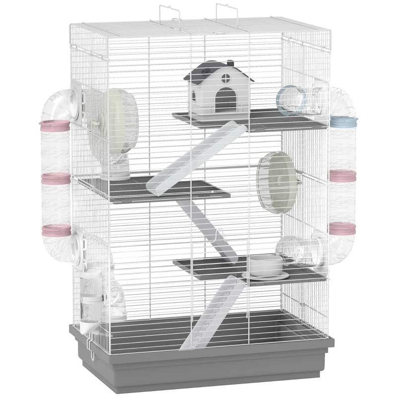 PawHut Gabbia per Criceti a 4 Livelli e 16 Tubi con Casetta, Rampa, e Accessori, in Metallo e Plastica, 47x30x70 cm, Grigio