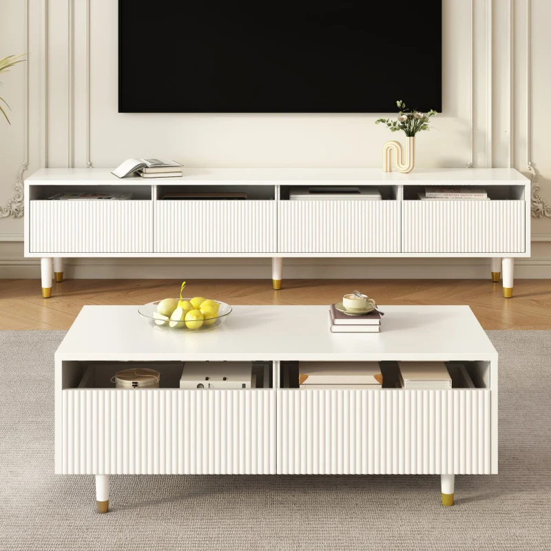Set 2 mobili contenitore a LED con 4 ante e 2 cassetti, 178x35x45 e 110x50x40 cm, Bianco