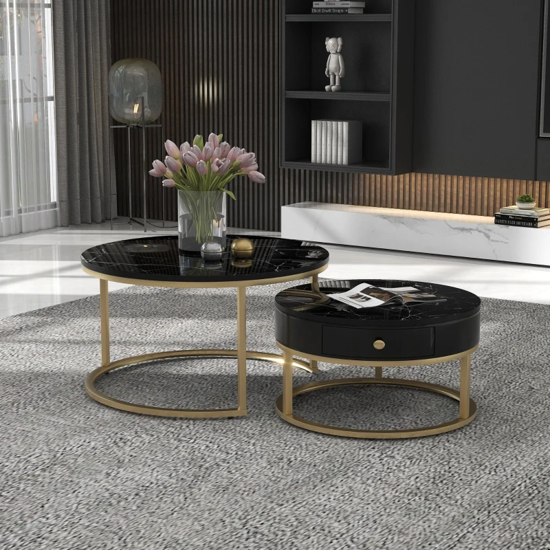 Set 2 tavolini moderni annidati in metallo effetto oro, 70x70x48 cm/50x50x43.5 cm, Nero
