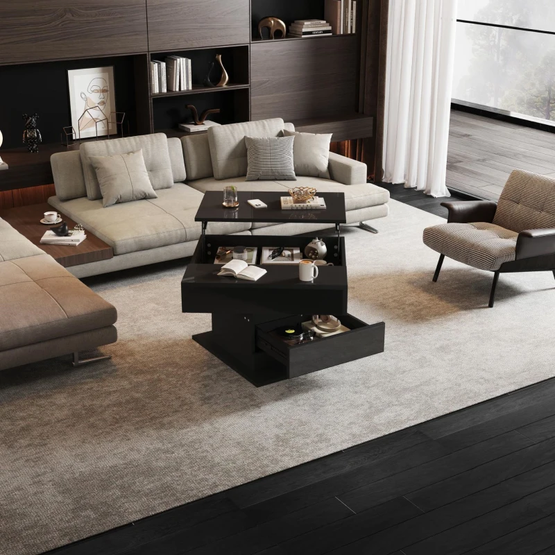 Tavolino da salotto girevole 360° con piano sollevabile, spazio a scomparsa e cassetto, 70x70x45 cm, Nero